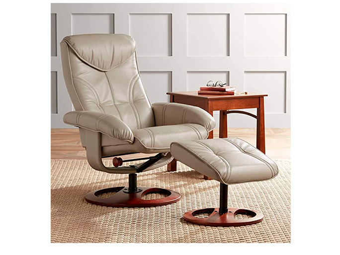 - La silla gira 360 grados y se reclina 45 grados. Piel regenerada en color gris pardo. Base de madera maciza con acabado de nogal.
